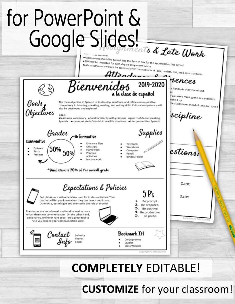 This document is an editable template for your secondary Spanish syllabus. There are sections for your contact information, course description, classroom expectations, required supplies, grading categories and percentages, classroom policies, discipline, absences, and more!